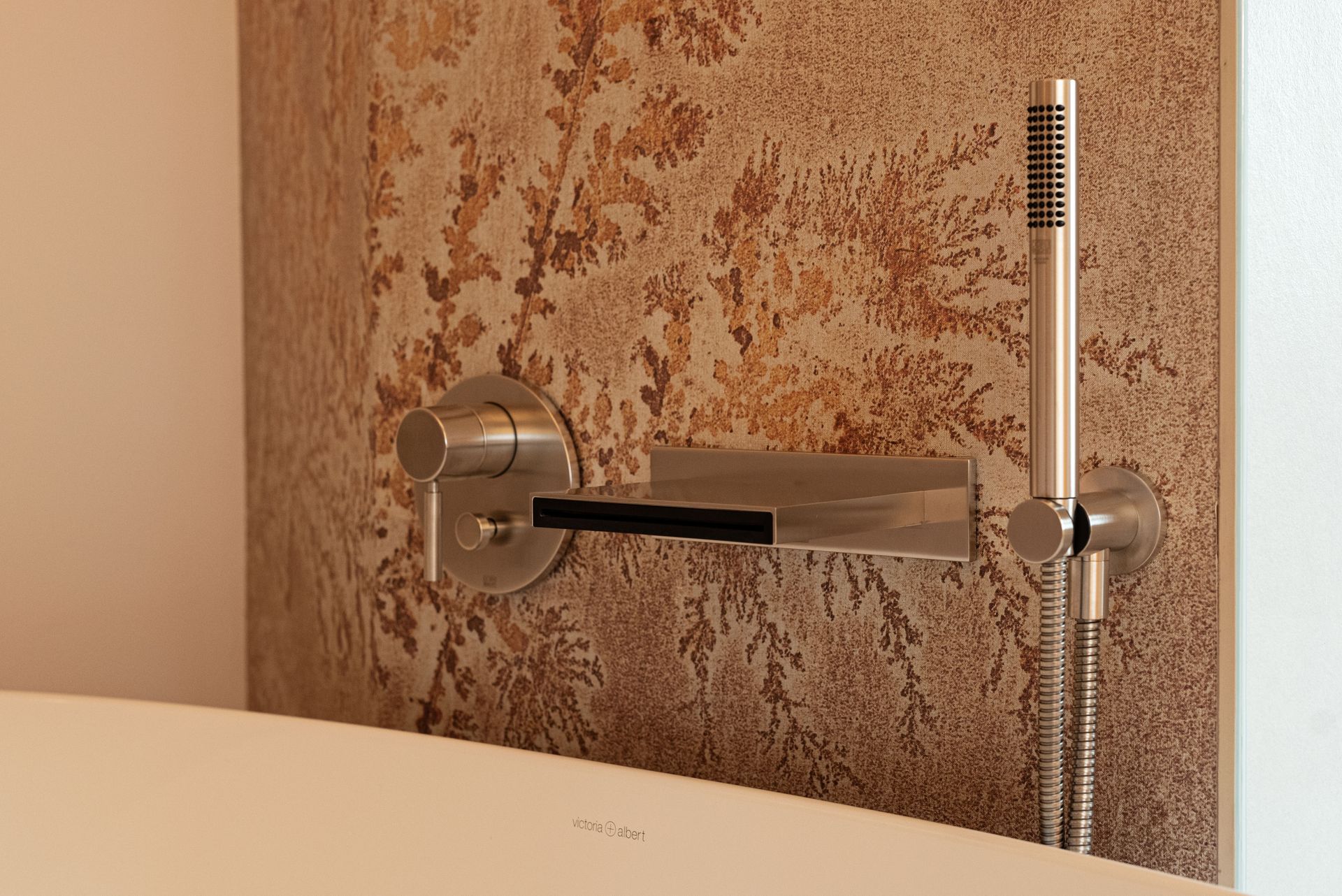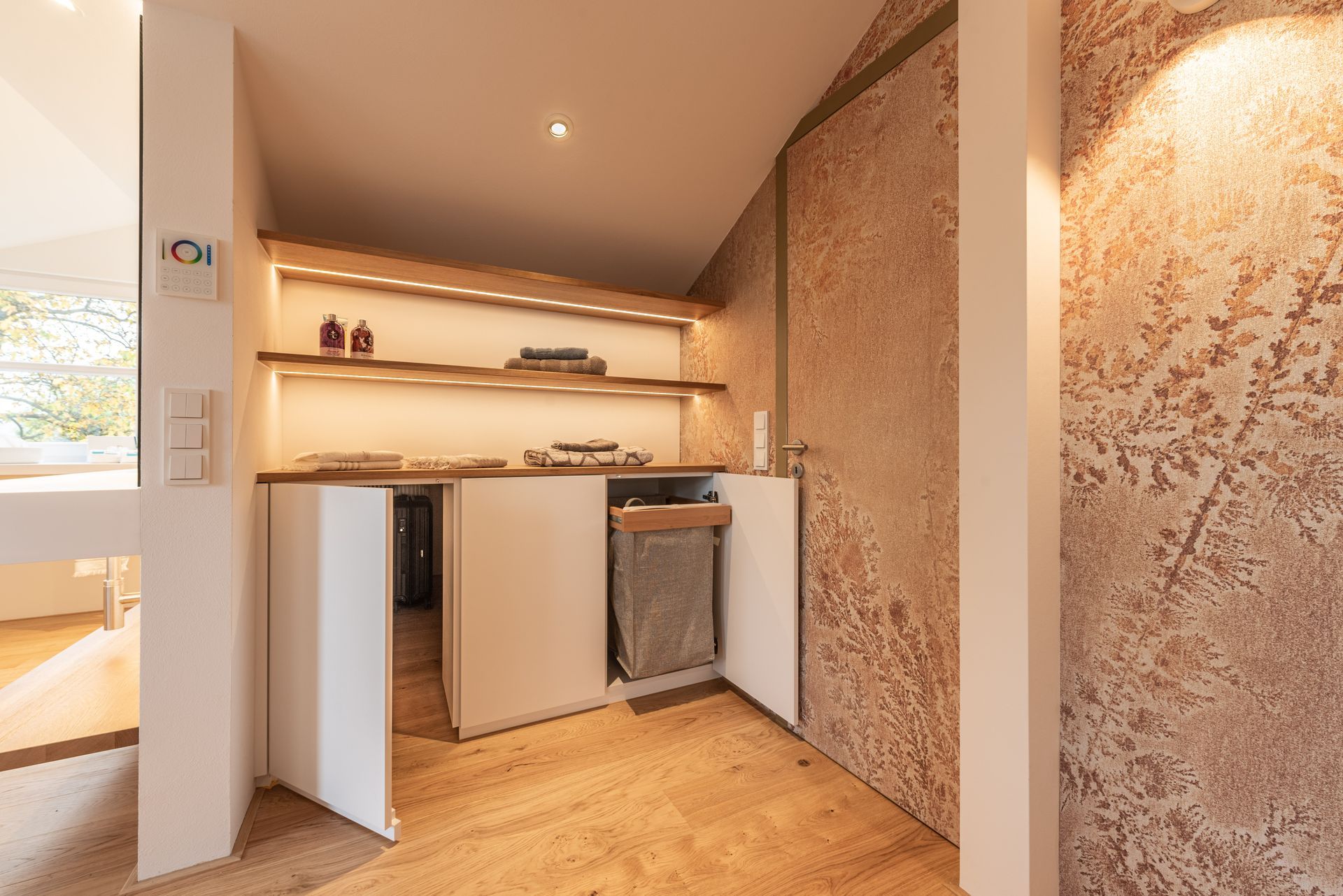 Nach gründlicher Planung konnte nun ein großzügiges Master-Bad entstehen. Was nicht fehlen durfte war eine freistehende Wanne, ein großzügiger Duschbereich, ein Doppelwaschtisch und ein Dusch-WC. Der Duschbereich wurde gefliest ansonsten wurde der Boden mit Eichenparkett belegt. Die Nischen wurden für den Stauraum genutzt. Vom Schreiner wurden die entsprechenden Einbauten gefertigt. Betritt man das Badezimmer fühlt man sich direkt angekommen. Angenehmes Licht mit verschiedenen Lichtpunkten, eine harmonische Farbgebung und natürliche Oberflächen mit einer angenehmen Haptik, tragen neben der offenen Grundrissgestaltung mit überraschenden Blickachsen zur Entspannung bei. Jetzt kann in Glück gebadet werden.